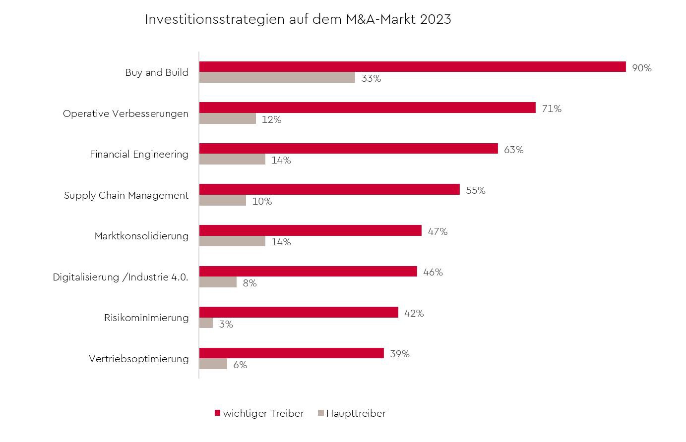 Auch in diesem Jahr sind strategische und ausländische Investoren die Haupttreiber hinter den M&A-Transaktionen. Es wird erwartet, dass der Anteil grenzüberschreitender Deals weiterhin auf einem hohen Niveau von rund 70 % bleiben wird. Insbesondere die USA bleiben die wichtigsten Käufer- und Zielländer. Neben den Buy-and-Build-Strategien rücken in diesem Jahr verstärkt operative Verbesserungen und Financial Engineering in den Fokus. Dies wird deutlich durch die folgende Grafik verdeutlicht: