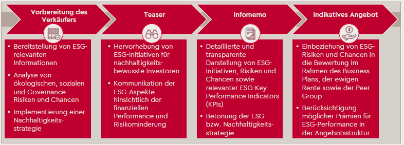 Durch das zunehmende Bewusstsein für Nachhaltigkeit werden ESG-Aspekte zu einem relevanten Entscheidungsfaktor einer Transaktion. Durch die Entwick­lung hin zu „Sustainable Investing“ fokussieren sich Investoren und Fremd­kapitalgeber einerseits auf „grüne“ Investments (positives Screening) und implementieren andererseits eigene ESG-Richtlinien, die zum Ausschluss nicht nachhaltiger oder ethisch kriti­scher Investitionen führen (negatives Screening). Daher sollten ESG-Strategi­en sowie ESG-bezogene Chancen und Risiken bereits in den frühen Phasen des Transaktionsprozesses, beginnend bei der Vorbereitung bis hin zum indikativen Angebot, berücksichtigt werden (siehe Abbildung 1).