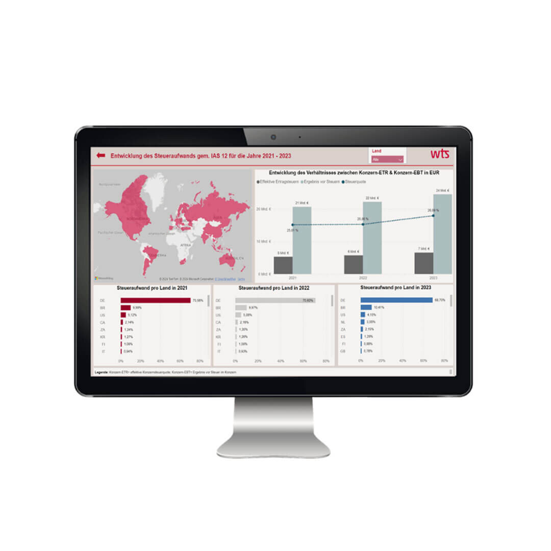 Dashboards bieten einen umfassenden Überblick über steuerliche Daten und erleichtern die Identifizierung von Trends und Auffälligkeiten. Wichtige KPIs im Ertragsteuerbereich umfassen unter anderem die effektive Steuerquote, Verlusthistorie, Quotentreiber, oder die Daten zu den Pillar 2 Safe Harbour Tests.
