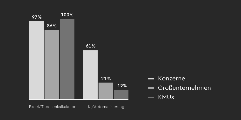 Viele Steuerfunktionen erscheinen im Alltag robust und stabil: Fristen werden eingehalten, Compliance-Anforderungen erfüllt. Dieser Zustand ist jedoch stark von einer manuellen Kompensation abhängig. 94 % der Unternehmen nutzen Excel als zentrales Arbeitsinstrument, 85 % ERP-Systeme, während nur 33 % KI- oder Automatisierungstools einsetzen.