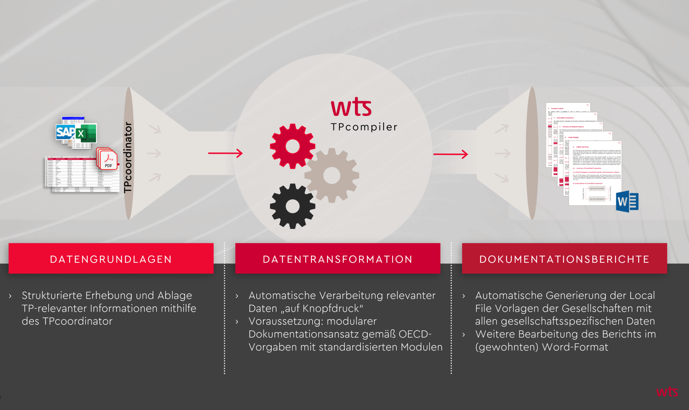 Steuerabteilungen können auf Basis ihres (zentralen oder dezentralen) Dokumentationsansatzes und ihrer Organisationsstruktur flexibel entscheiden, wie die weitere Dokumentationserstellung ablaufen soll. Im ersten Schritt werden die Daten mithilfe des TPcoordinator eingesammelt und strukturiert aufbewahrt. Die Integration in systemgestützte Softwarelösungen zur Dokumentationserstellung von Drittanbietern, sowie die Bereitstellung von Daten für externe Berater zur Dokumentationserstellung werden vollumfänglich unterstützt. Ebenso ist eine nahtlose Anbindung an unsere eigenen WTS-Lösungen wie den TPcompiler*möglich.