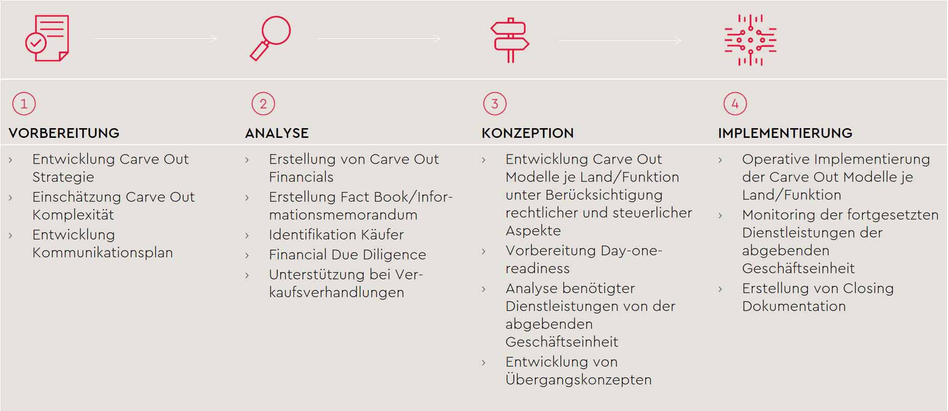 • Entwicklung von Carve Out Modellen je Land/Funktion unter Berücksichtigung rechtlicher und steuerlicher Aspekte