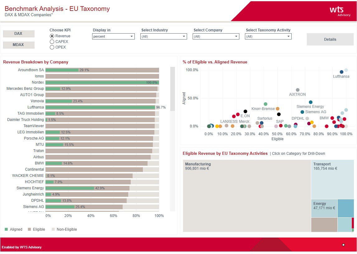 Große börsennotierte Unternehmen waren erstmalig für das Geschäftsjahr 2022 verpflichtet, sowohl Taxonomiefähigkeit als auch Taxonomiekonformität ihrer Geschäftstätigkeiten offenzulegen. Wir haben die Taxonomie-Daten der DAX und MDAX-Unternehmen in einem Taxonomie-Dashboard aggregiert.