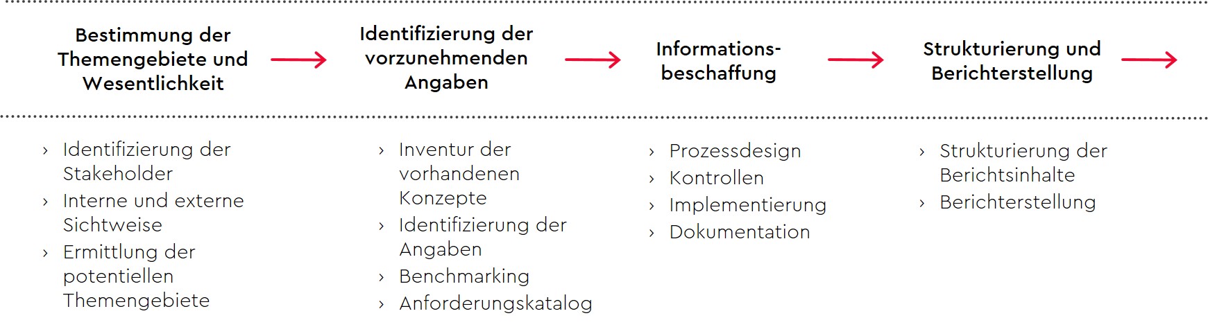 Als Experten für Berichtsprozesse unterstützt Sie die WTS Advisory bei der prozessualen Umsetzung sowie der Erstellung der nichtfinanziellen Erklärung. Unsere integrierte Vorgehensweise finden Sie folgend vereinfacht dargestellt.
