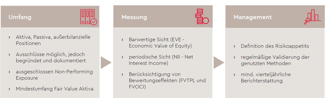 Neben einer Definition des CSRBB enthält die Leitlinie Anforderungen an das interne Management, dazu gehören Regelungen zu Governance, Messung, Steuerung, Überwachung und IT, ähnlich der Anforderungen zum IRRBB.
