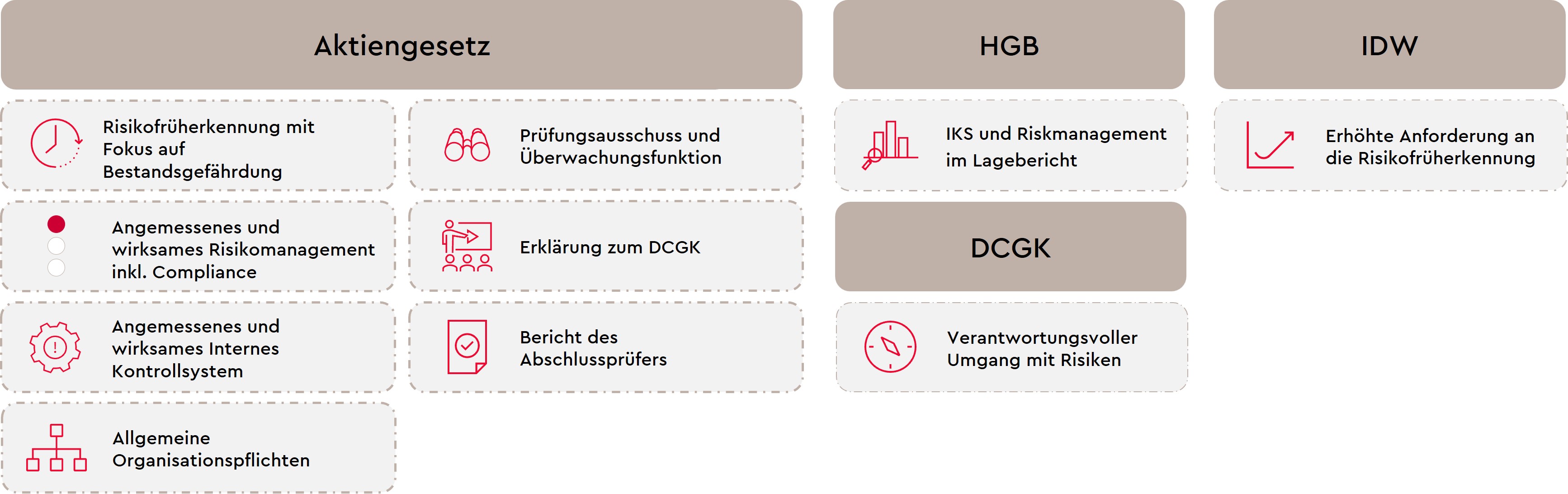 Corporate Governance bildet einen wesentlichen Bestandteil der Kapitalmarktanforderungen im Rahmen eines Börsengangs. Im Rahmen des Börsengangs haben Unternehmen einen rechtlichen und faktischen Ordnungsrahmen für die Leitung und Überwachung zu schaffen. Dieser Ordnungsrahmen geht von der Gesamtheit aller internationalen und nationalen Regeln sowie Vorschriften aus und spiegelt sich in den Werten und Grundsätzen, den Prozessen und Dokumentationen, die Unternehmen für sich selbst gestalten. Die regulatorischen Anforderungen betreffen insbesonderedie bekannten Überwachungsfunktionen wie beispielsweise