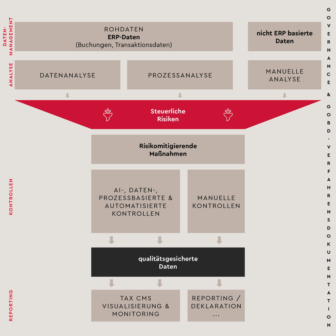 Unserer Wahrnehmung nach liegt dies vor allem daran, dass die meisten Tax CMS  aus manuellen Stichprobenkontrollen bestehen, deren kontinuierliche Durchführung und Dokumentation – oft noch in einer Excel basierten Risiko-Kontroll-Matrix – in der Praxis mit erheblichem Aufwand verbunden ist.