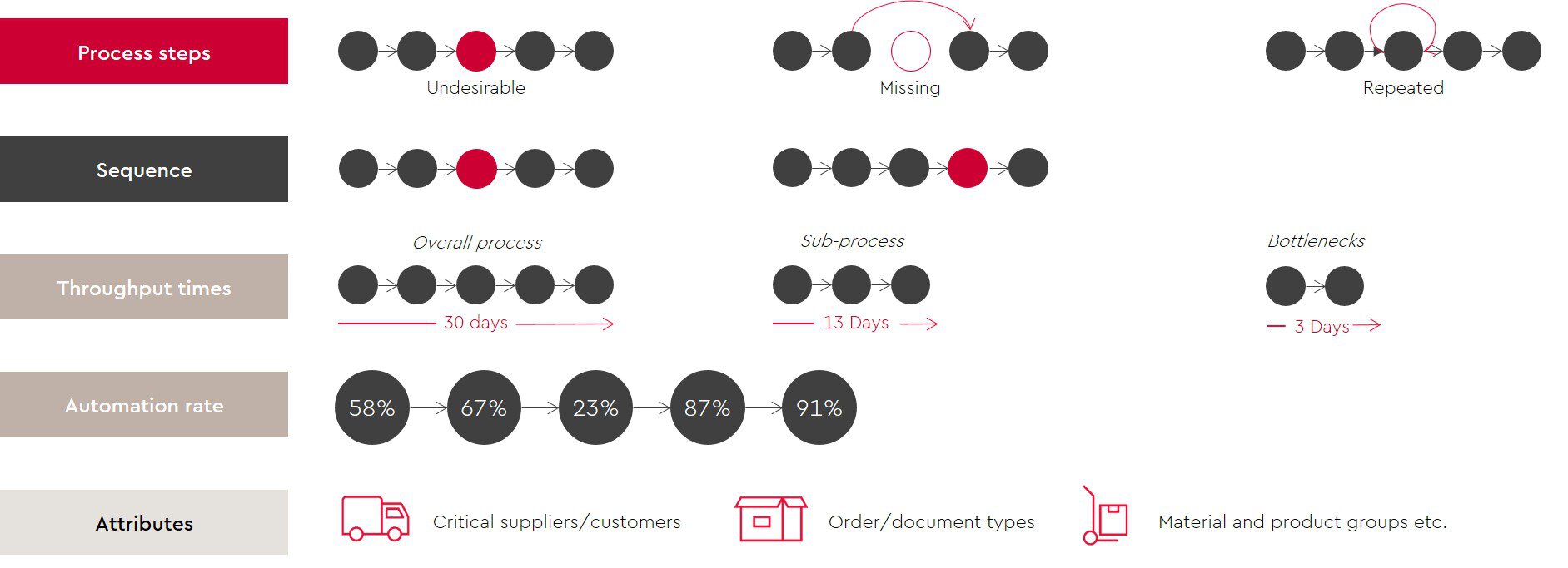 In recent years, process mining has established itself as the leading technology for the visualization and analysis of process flows. The process mining software evaluates the "digital footprint" of individual process steps across all systems. The software uses algorithms to identify trends, patterns and details across the entire process flow. The advantages of implementing and using process mining are in particular the process transparency at a granular level, the visibility of all process variants and the rapid determination of the process quantity structure.
