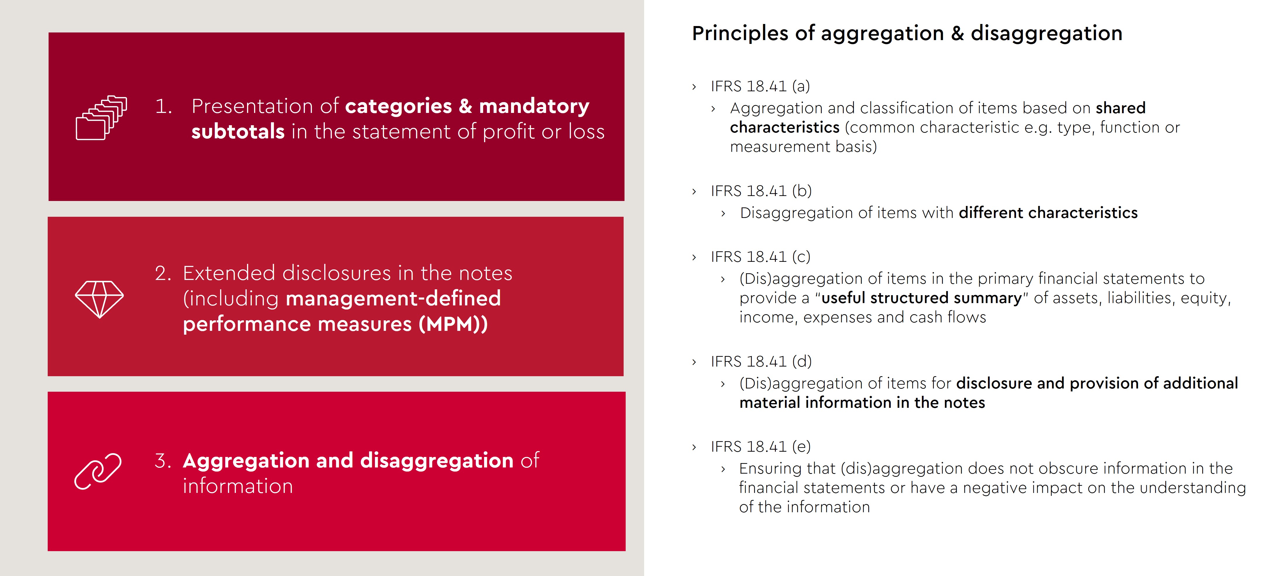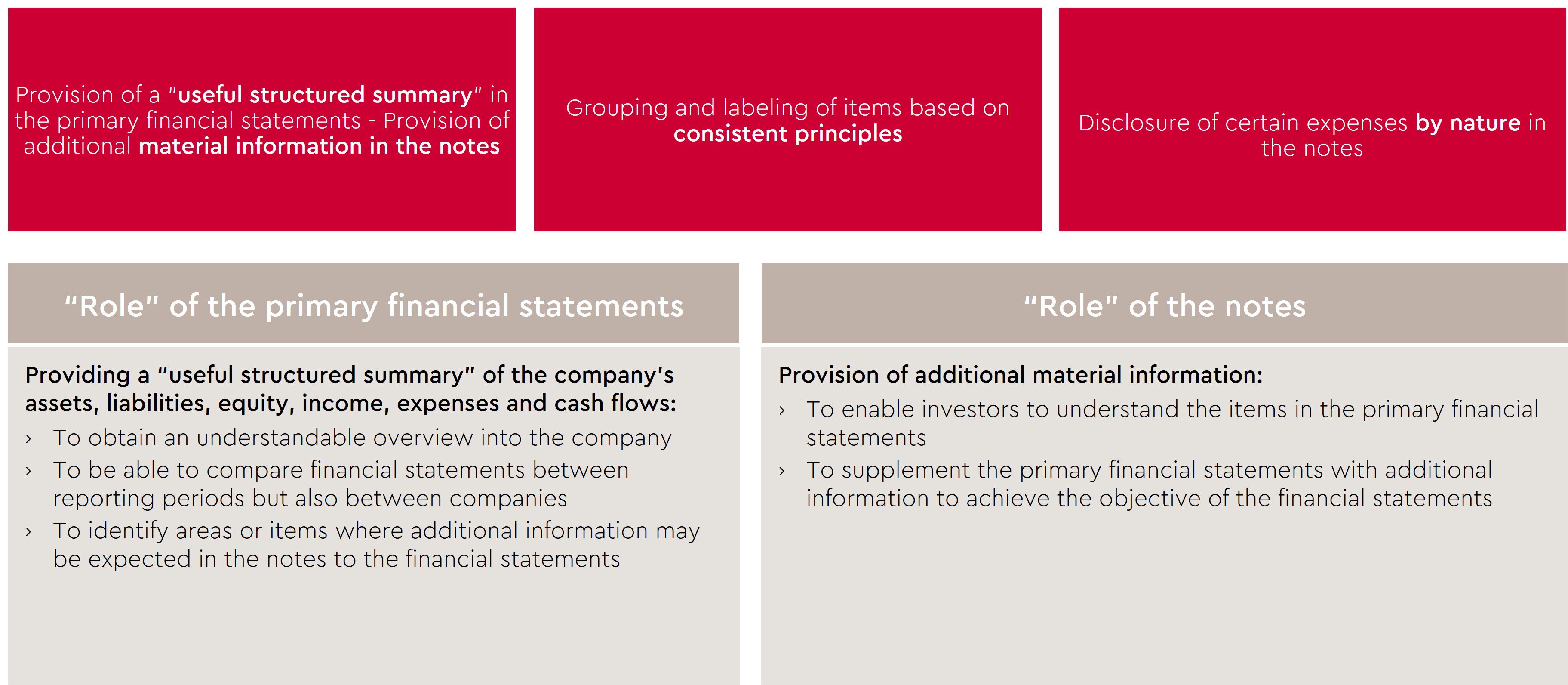 In the future, new principles-based aggregation and disaggregation guidelines for grouping information must be taken into account. This classification is based on common or non-common characteristics of items in the primary financial statements. This includes, among other things, newly defined “roles” for the primary financial statements and for the notes.