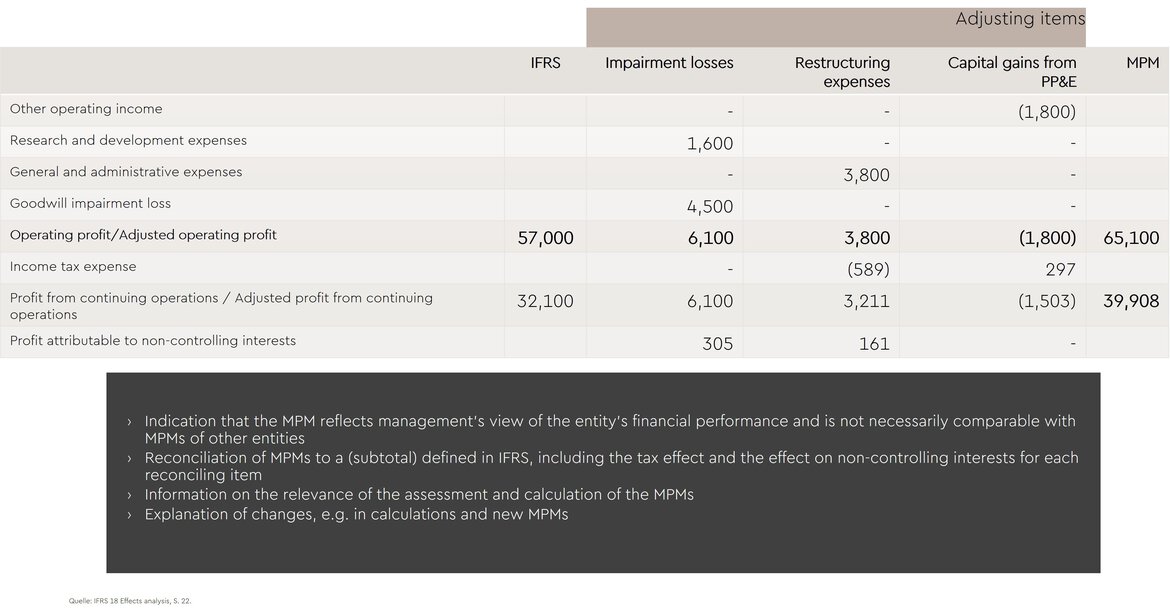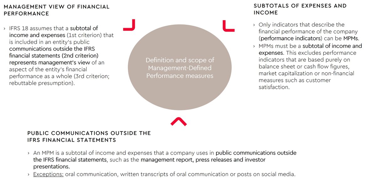 Among other things, the management-defined performance measures (MPMs) defined and publicly communicated by the company or its management must be disclosed in the notes. A reconciliation must be provided between an MPM and the most directly comparable subtotal listed in IFRS 18 or the total or subtotal required by IFRS accounting standards, including income tax and other effects. The reason for the assessment relevance of the MPMs must also be disclosed.