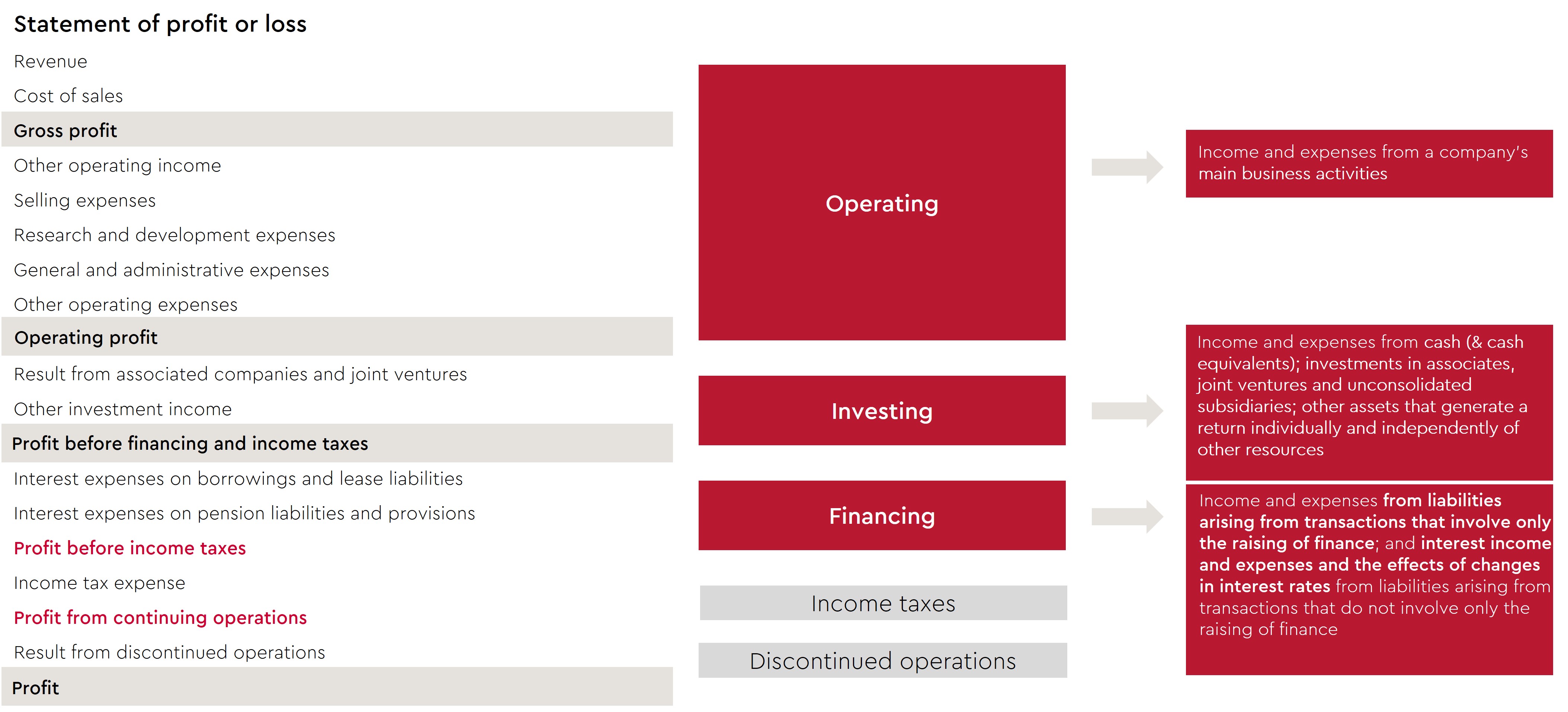 In the future, two newly defined and mandatory subtotals will be added to the income statement: „Operating profit“ and „profit before financing and income taxes“. This will be accompanied by the introduction of three new categories for structuring income and expenses: The operating category (“operating”), the investing category (“investing”) and the financing category (“financing”):
