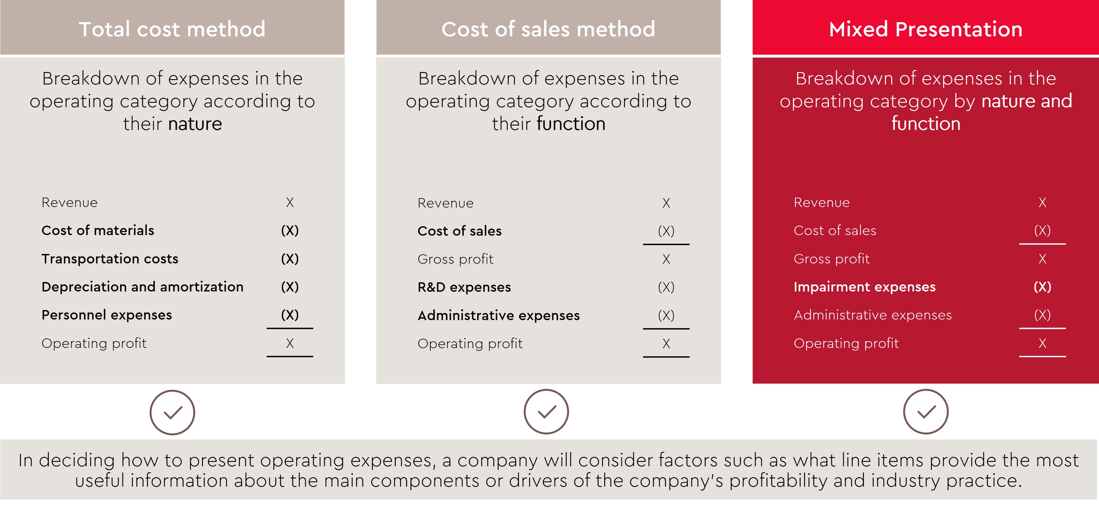 In the future, the new IFRS 18 will allow companies to choose whether to present their expenses in the operating category according to their nature (total cost method), their function (cost of sales method) or a mixture (so-called “mixed presentation”), i.e. some expenses according to function and others according to their nature.