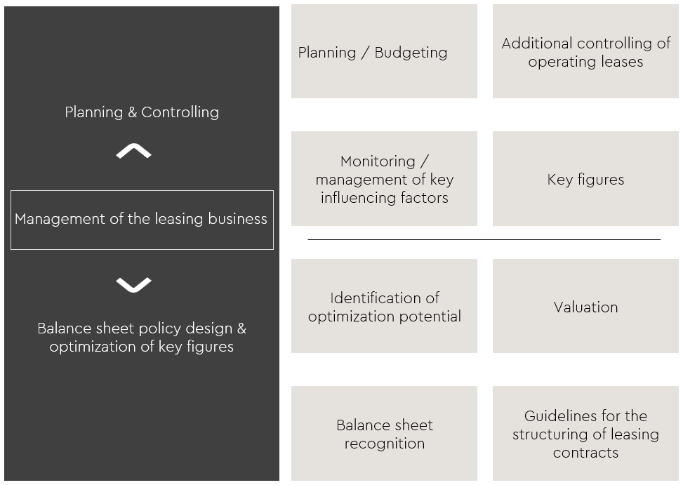 Controlling must be able to master the new requirements for planning and budgeting, possibly based on different initial data, and deliver reliable figures for the group. In addition, the impact of leases on the balance sheet under the new right-of-use approach (IFRS and US GAAP) has increased the importance of monitoring key influencing factors and indicators (e.g. EBIT, debt-to-equity ratio) in connection with leasing. As experts, we support you in developing effective controlling. To this end, we have developed LeaseCOCKPIT, which we would be happy to present to you in a non-binding webinar.