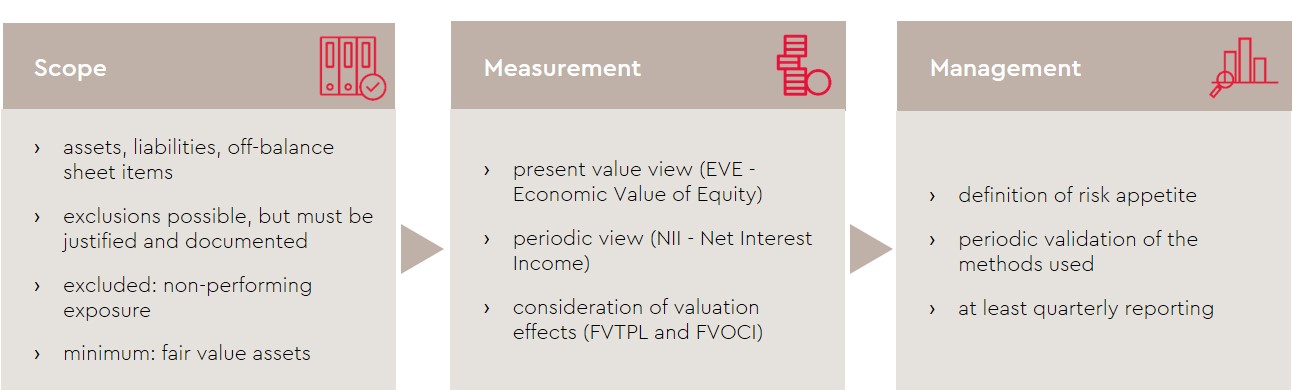 In addition to a definition of CSRBB, the guideline contains requirements for internal management, including regulations on governance, measuring, management, monitoring and IT, similar to the requirements for IRRBB.